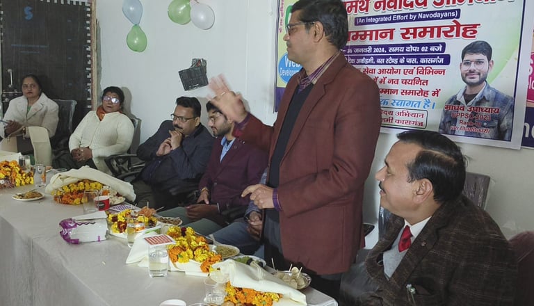 Samarth Navodaya Abhiyan (SNA) organized a special felicitation ceremony to honour Madhav Upadhyay, who secured All India Rank 10 in the UPSC Civil Services Examination, marking a moment of pride for the Navodaya alumni community and the region. The event was conducted to recognize academic excellence, inspire aspiring students, and strengthen the culture of merit-based encouragement within the Navodaya ecosystem. During the ceremony, members of SNA and distinguished guests congratulated Madhav Upadhyay for his outstanding achievement and dedication. The interaction provided valuable motivation to students preparing for competitive examinations. Objectives of the Felicitation To celebrate exceptional academic achievement To motivate JNV aspirants and alumni To promote a culture of merit and perseverance To strengthen alumni–student engagement The program reflected SNA’s continued commitment to recognizing excellence and supporting aspirants through mentorship, guidance, and community-driven initiatives. Samarth Navodaya Abhiyan remains dedicated to organizing such motivational and recognition programs to encourage youth toward disciplined preparation and responsible leadership.